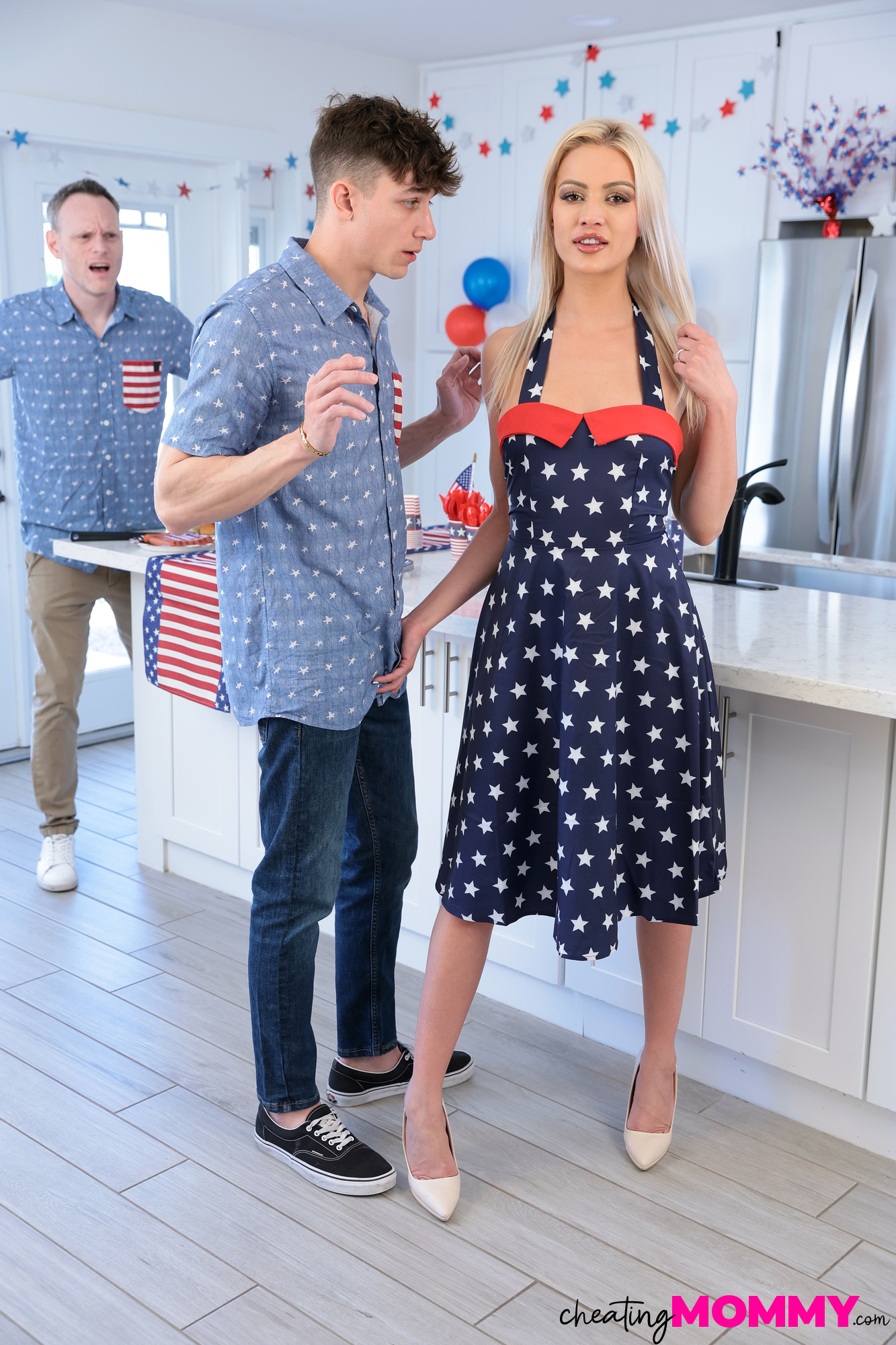Photos description: Parker Ambrose and his dad Mitt are setting up for a barbeque when Parker's stepmom Cherry Kiss comes in dressed to impress. When Mitt says things are coming along and going outside, Cherry immediately goes into vixen mode. She complains about how hot she is, flapping her dress and then removing her panties so she can fan her pussy. After watching Cherry for a moment, Parker asks if she needs some ice. She agrees that she does, then asks Parker to blow on it too. They have a near miss with Parker's dad, but that just makes Cherry want it even more. She has Parker eat her out until his dad opens the door again, then a little bit more for good measure. Unable to stop now, Cherry then insists Parker fucks her. Now it's all about holding the moan as Cherry bends over the counter and takes it from behind. A blowjob lets her enjoy their combined juices until she gets Parker on his back so she can ride him in reverse cowgirl, then in cowgirl. Climbing onto the counter, Cherry wraps her legs around Parker's hips to draw him in nice and deep until he has to pull out to nut all over her landing strip cooch.