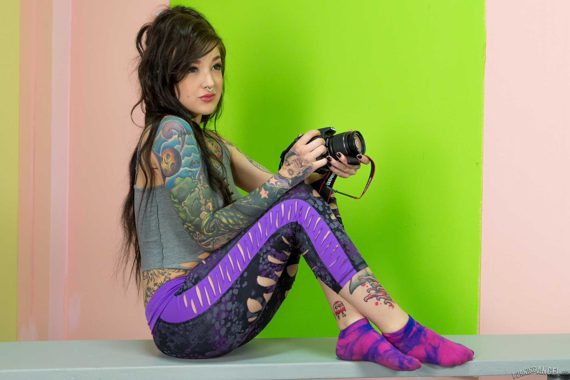 Photos description: Kelsi Lynn was creeping around in the boys' lockerroom with her camera because she wanted to take some dirty photos of Van Wylde - a hot, sweaty jock! Initially he was mad she was spying on him, but when she mentioned that she needed a picture of his cock, he changed his tune. Some athletes don't really understand art - but this one understands that Kelsi wants his prick and she was more than willing to help make it nice and hard with her mouth and her tight young pussy! Socks on, yoga pants off! He was so strong, he lifted Kelsi up and fucked her while standing, and she got a workout with his massive meatstick on the bench doggystyle like a champion horny slut!